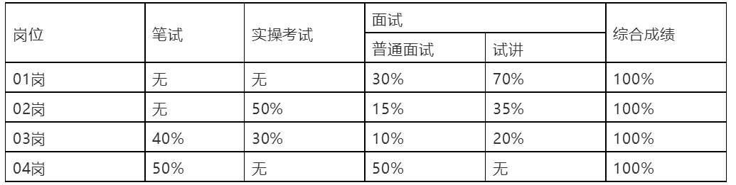 考试由笔试、实操考试、普通面试、试讲几方面组成,具体要求及分值占比见下表