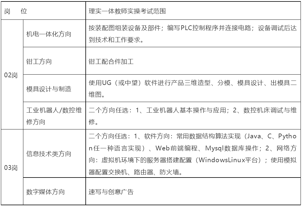 2、实操考试:02岗、03岗需参加实操考试。实操考核由专家进行评分,满分100分,按一定比例计入总成绩,参考人数大于或等于1:3的实操考试成绩按1:3进入下一考试环节,同时低于60分的直接淘汰;参考人数不足1:3时75分以下的淘汰。02岗、03岗理实一体化教师实操考试范围如下:
