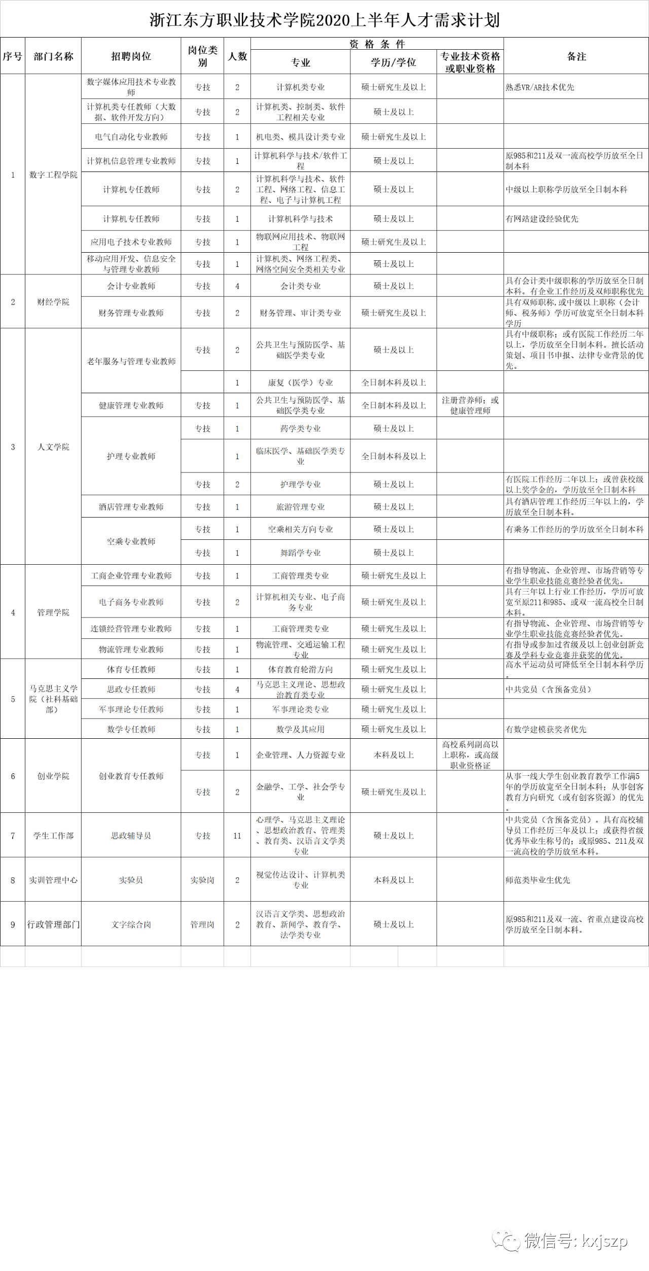 附件:1.2020年浙江东方职业技术学院人才师资需求表