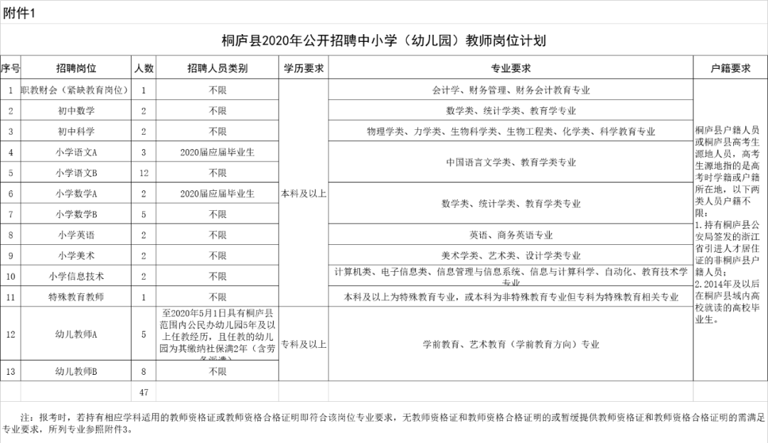 根据《杭州市事业单位公开招聘工作人员操作程序(试行)》(杭人社发〔2014〕380号)、《桐庐县事业单位公开招聘人员暂行规定》(桐政办〔2008〕60号)等文件精神,结合桐庐县教育事业发展实际需要,决定面向2020届普通高校应届毕业生和社会人员公开招聘事业编制中小学(幼儿园)教师47名,现将有关事项公告如下: