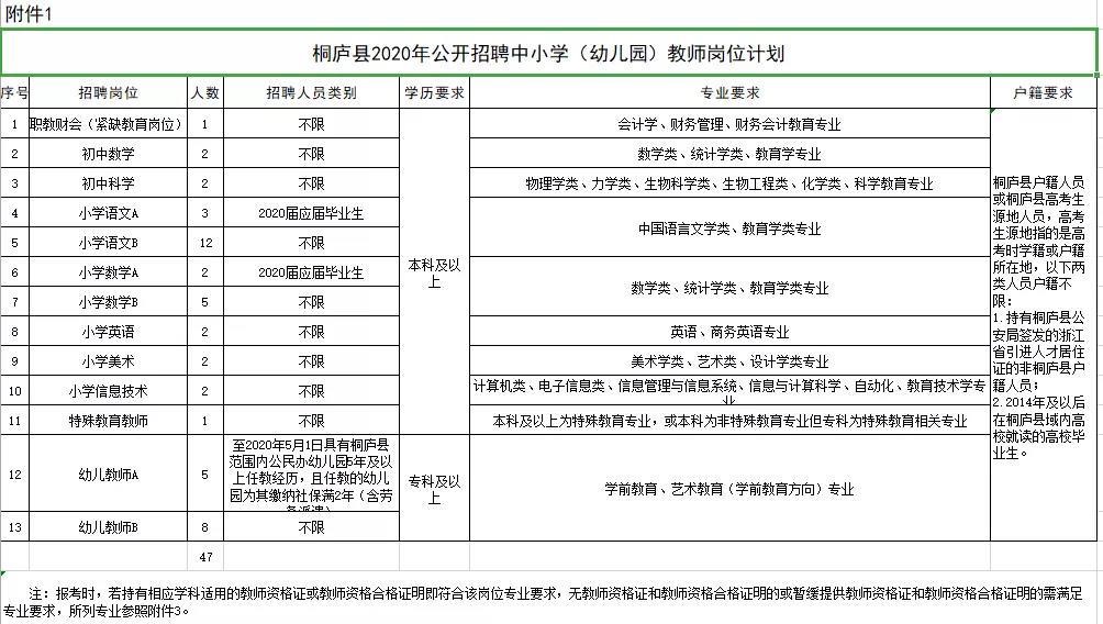 根据《杭州市事业单位公开招聘工作人员操作程序(试行)》(杭人社发〔2014〕380号)、《桐庐县事业单位公开招聘人员暂行规定》(桐政办〔2008〕60号)等文件精神,结合桐庐县教育事业发展实际需要,决定面向2020届普通高校应届毕业生和社会人员公开招聘事业编制中小学(幼儿园)教师47名,现将有关事项公告如下: