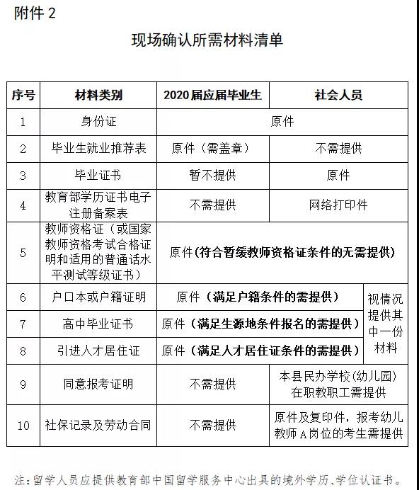 (1)根据人社部、教育部等七部委《关于应对新冠肺炎疫情影响实施部分职业资格“先上岗、再考证”阶段性措施的通知》(人社部发〔2020〕24号)等精神,2020届普通高校应届毕业生报名时暂不要求提供相应的教师资格证和普通话等级证书,但须在2021年7月31日前取得相应的教师资格证书和普通话等级证书(报考紧缺教育岗位、小学信息除外),届时未取得者予以解聘。