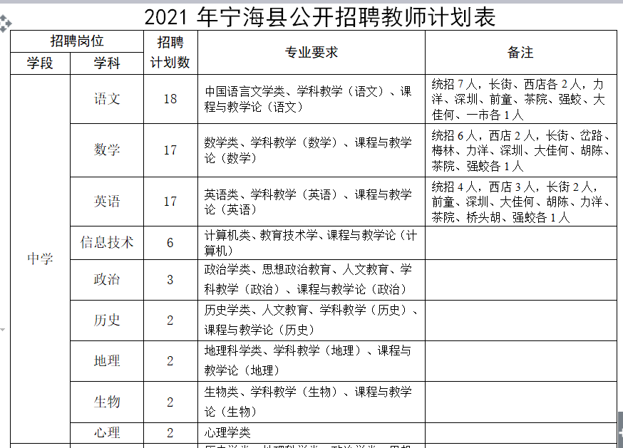 共招聘教师134名。具体招聘岗位、计划数、专业要求等详见《2021年宁海县公开招聘教师计划表》。