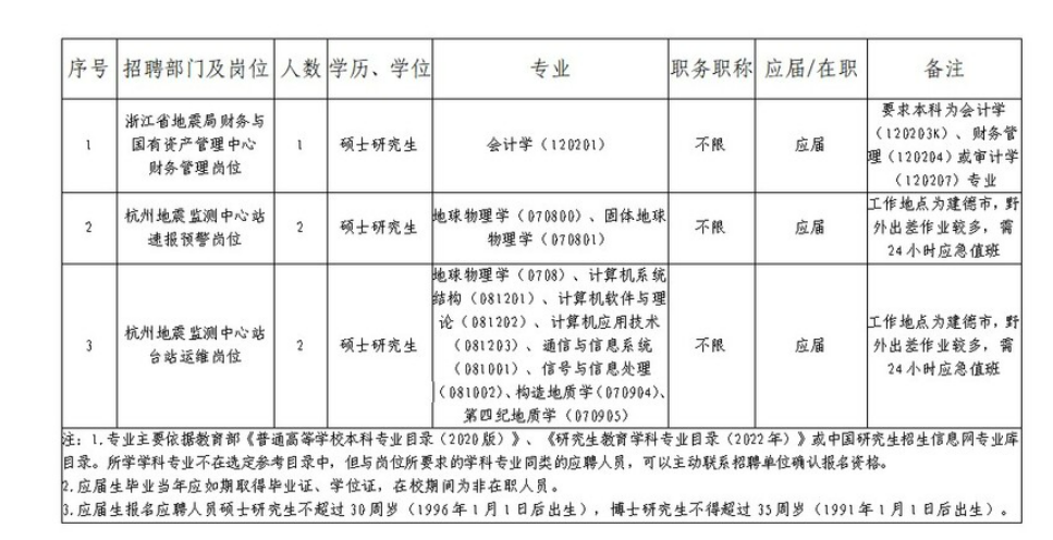 为满足事业单位补充工作人员需要,根据《事业单位人事管理条例》、《事业单位公开招聘人员暂行规定》、《中国地震局进人管理办法》等有关规定,2026年度浙江省地震局局属事业单位拟面向社会公开招聘5名硕士研究生及以上学历应届毕业生。现将有关事项公告如下。