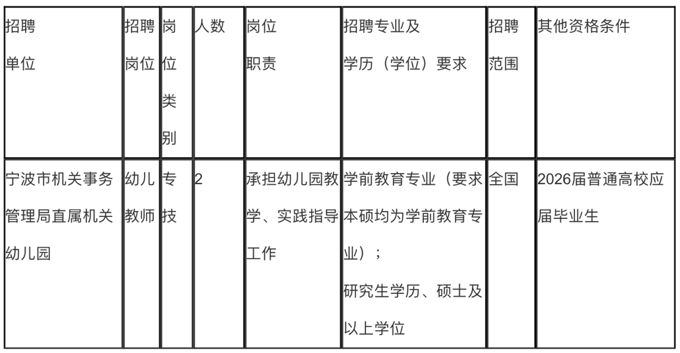 根据《宁波市事业单位公开招聘工作人员实施办法》的有关规定,宁波市机关事务管理局决定面向社会公开招聘直属机关幼儿园事业编制幼儿教师2名。现就有关事项公告如下: