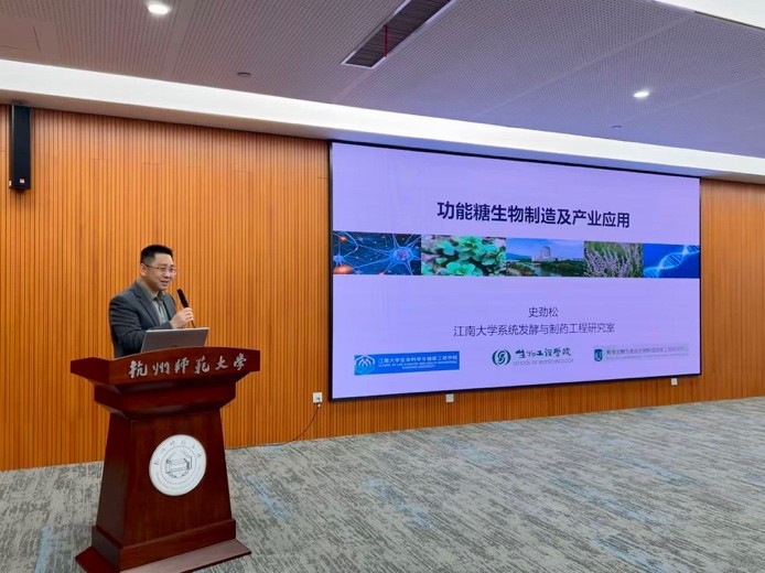 2025年11月12日下午,江南大学史劲松教授受邀出席杭州师范大学药学院“博雅论坛”,作题为《功能糖生物制造与产业应用》的学术报告。本场报告不仅是前沿科研内容的系统呈现,更是一次关于“科学研究如何有效对接产业需求”的生动示范,为药学院师生在交叉学科研究、技术转化路径等方面提供了宝贵思路与实践范例。报告由药学院学术副院长陈大竞教授主持,学院近百名师生踊跃参与,现场座无虚席,交流气氛热烈。