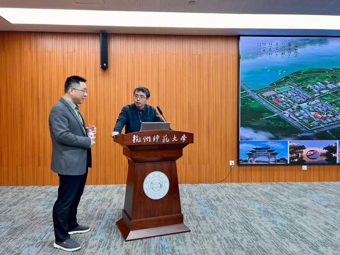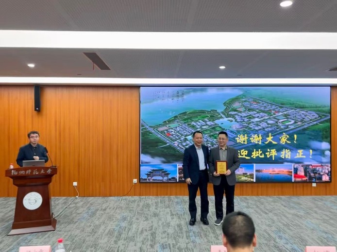 报告尾声,药学院党总支书记赵飞代表学院向史劲松教授赠与授课铭牌,感谢他为杭师大师生带来的精彩报告与深度启发,也寓意着两校之间学术交流与科研合作的进一步深化。