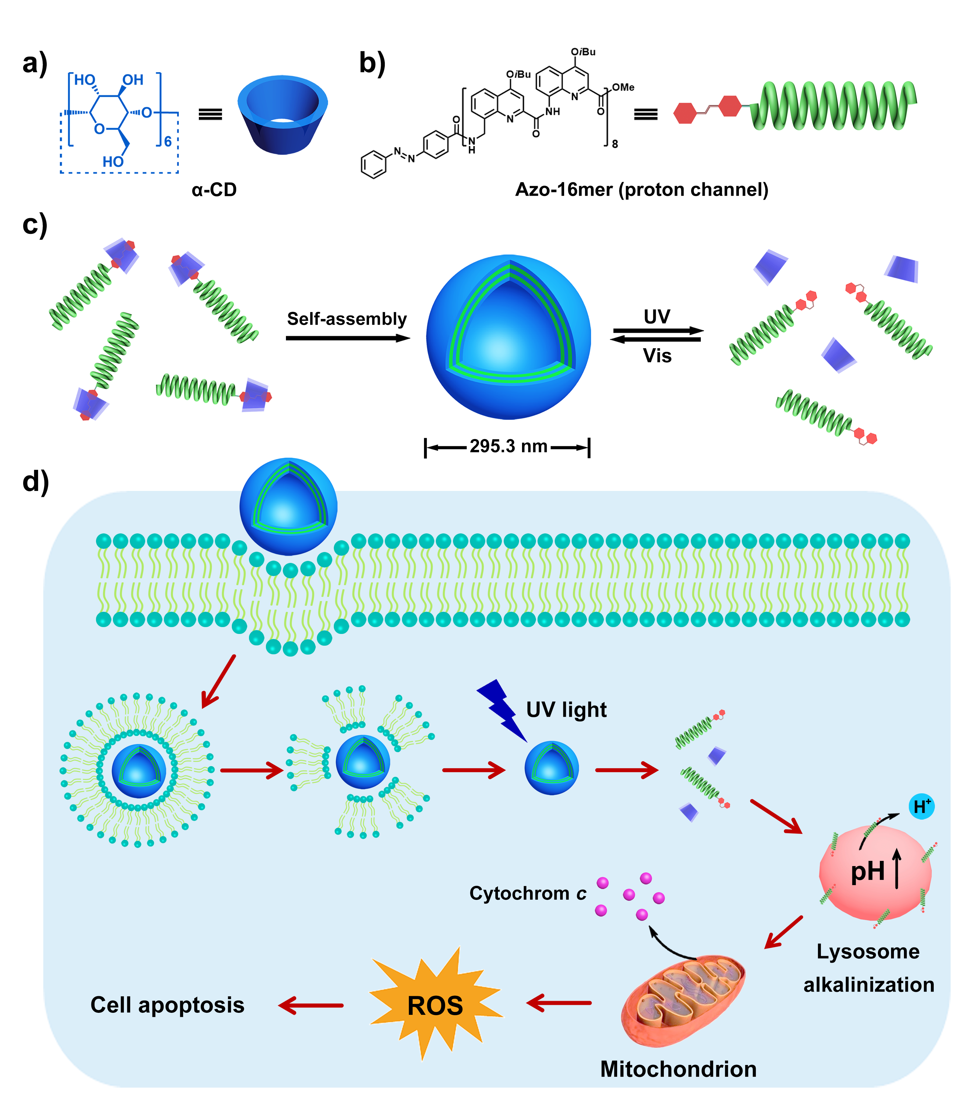 针对以上难题,杭州师范大学刘俊秋教授团队受传统药物递送系统(DDS)启发,巧妙设计了一种全新的光控离子通道递送系统(ICDS)。该系统基于主客体超分子自组装技术,由亲水性的α-环糊精与疏水性的偶氮苯修饰的喹啉螺旋体(一种人工质子通道)构成,能在水溶液中自组装形成纳米胶囊。该纳米胶囊可通过内吞作用轻松进入肿瘤细胞。在紫外光照射下,偶氮苯基团发生顺反异构化,导致纳米胶囊解组装,并释放出人工质子通道。人工质子通道可进一步中和酸性细胞器(如溶酶体)、降低线粒体膜电位、升高活性氧水平,最终诱导癌细胞凋亡。作者期待这种全新的离子通道递送系统能为人工离子通道提供新的治疗思路。