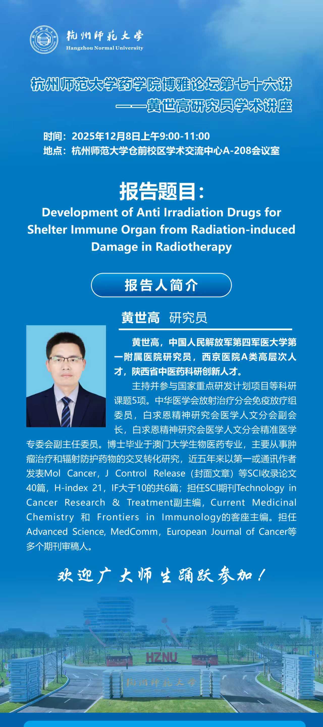 讲座主题:Development of Anti lrradiation Drugs for Shelter lmmune Organ from Radiation-induced Damage in Radiotherapy
