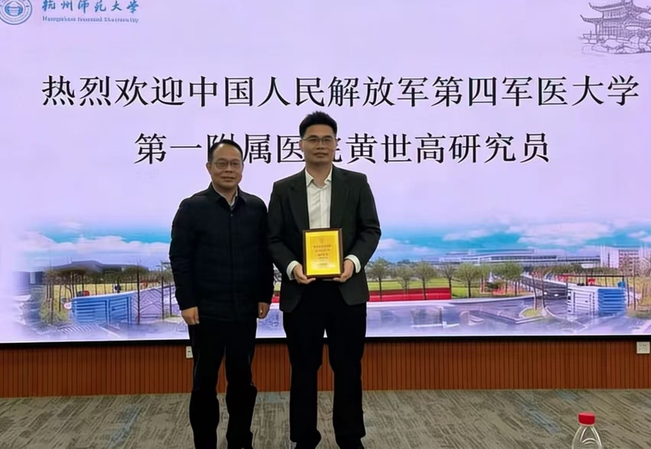 讲座最后,药学院赵飞书记为黄世高教授颁发了博雅学术讲座纪念铭牌。此次讲座不仅为杭师大药学院师生提供了一次难得的学习与交流机会,也进一步加深了我校与中国人民解放军第四军医大学之间的学术联系,为未来的科研合作奠定了坚实基础。
