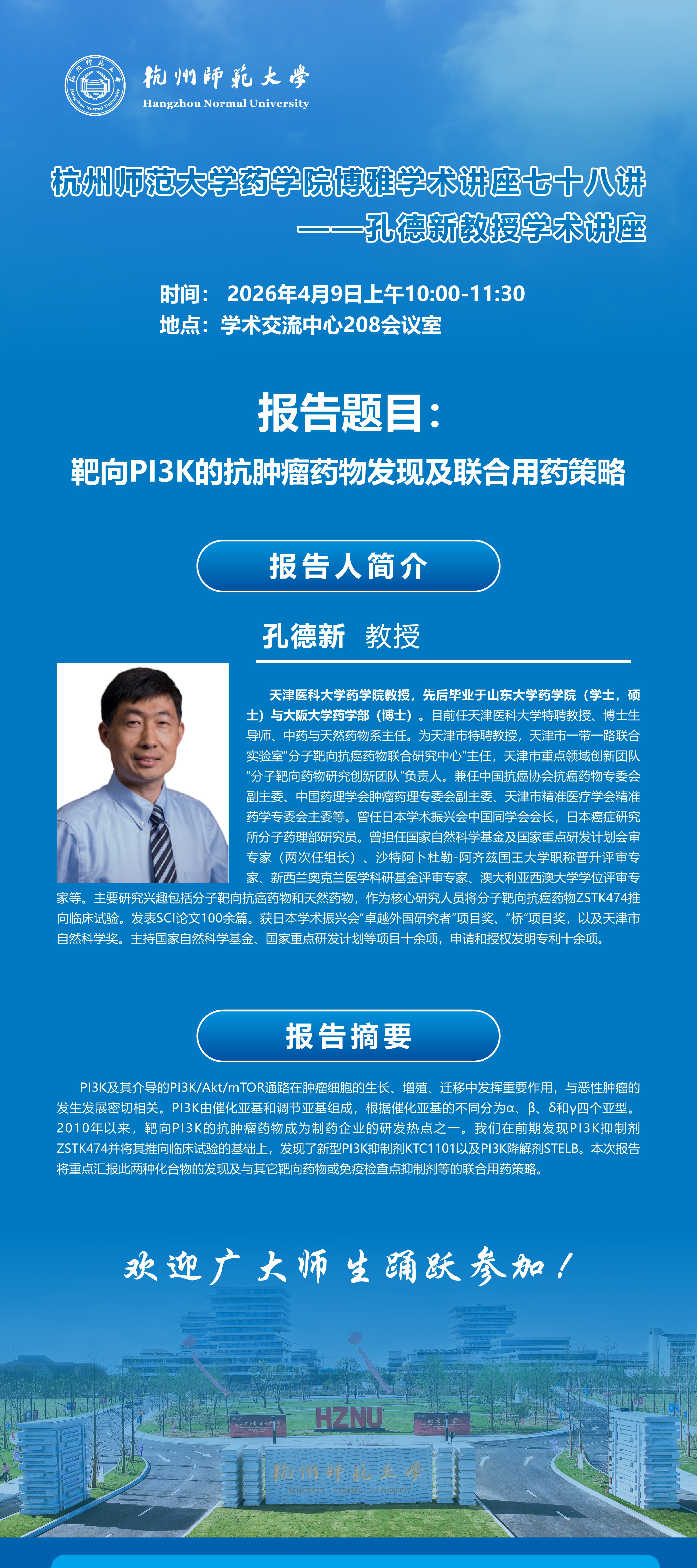 讲座主题:靶向PI3K的抗肿瘤药物发现及联合用药策略